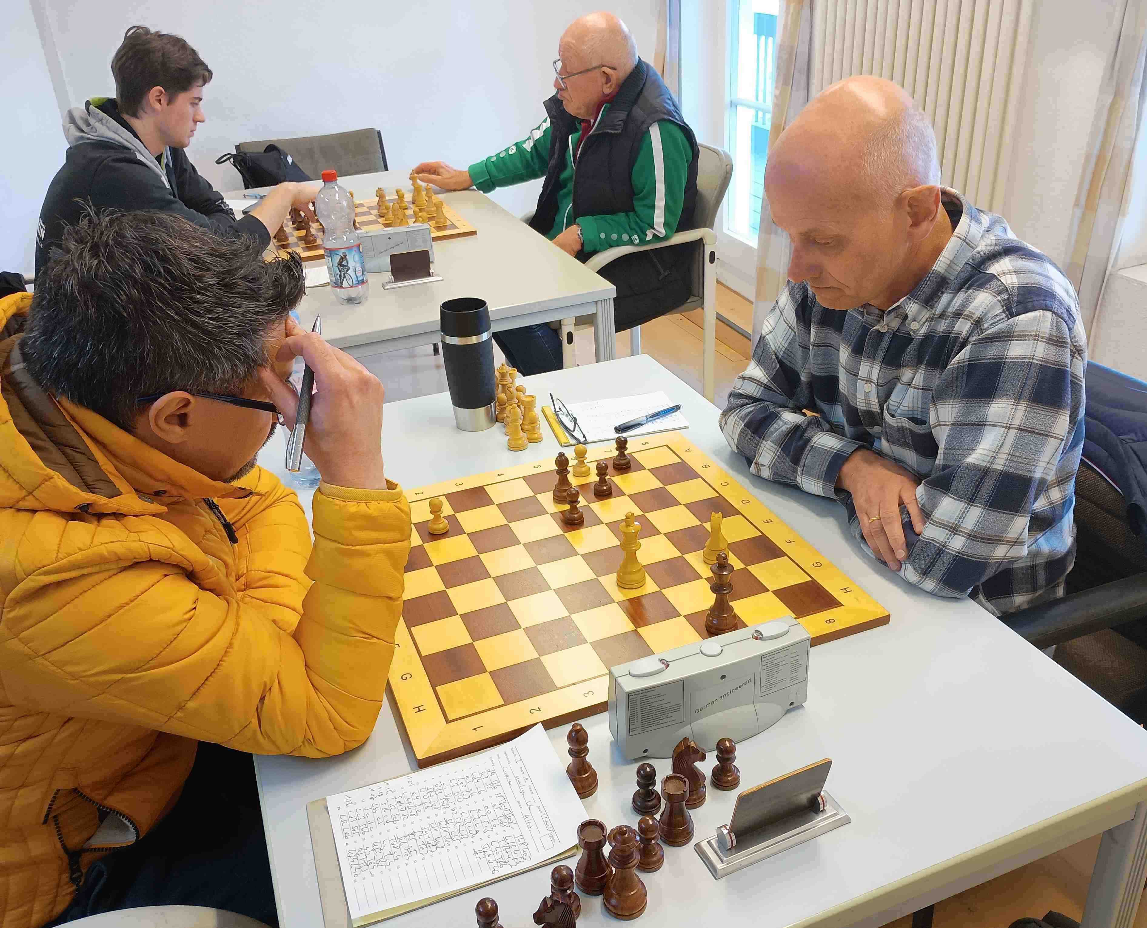 2025 beteiligt sich auch die SVG Vaihingen/Enz mit ein 4-rer Mannschaft an diesem besonderen Pokal-Turnier im Schachbezirk Unterland mit den Gruppen Nord (ehemaliger Kreis Heilbronn und Hohenlohe) und Gruppe Süd (ehemaliger Kreis Ludwigsburg). Es wird in 3 Wertungsgruppen gespielt, Gruppe A: Bundes- bis Landesliga, Gruppe B: Bezirksliga und Kreisklasse, Gruppe C: A-Klasse und darunter. Und es gibt hier eine ganz spezielle Bedenkzeitregelung: Die Bedenkzeit für die die ganze Partie beträgt 45 Minuten pro Spieler, aber es gibt es eine Bedenkzeit-Zugabe von 15 sec. pro Zug. Dies bedeutet z.B. bei einer Spieldauer von 40 Zügen gibt es einen Bedenkzeit-Zuschlage von 40 x 15 sec = 600 sec, bzw. 10 Minuten. Und dies bedeutet, dass hier nur Spezialuhren zum Einsatz kommen können, die solch eine Regelung ermöglichen. Und hierbei hatten wir hier in Vaihingen schon ein kleines Problem, so dass diese Begegnung schlussendlich mit einer Punkte-Teilung endete. – aber davon später etwas mehr. Bei dieser Pokalrunde beteiligen sich 18 Mannschaften aus dem Schachbezirk Unterland und davon werden 3 Partien bei den Vereinen gespielt und die letzten 2 Partien bei einer Zentralveranstaltung, diesmal in Pattonville, ausgetragen.Wir starteten also mit unseren 4 Spielern mit dem Bewusstsein, dass die Spieler für die Schachpartie nur 45 Minuten Zeit hatten, also mussten sich unsere Spieler schon sputen, um Ihre Partien innerhalb dieser 45 Minuten zu einem hoffentlich positiven Abschluss zu bringen. Dass es dabei jedoch pro ausgeführten Zug eine Zeitzugabe von 15 sec. gibt hatten die meisten Spieler nicht so ganz auf Ihrem Gedanken-Schirm und spielten fast alle recht zügig. Und den Ingersheimern Spielern ging fast so ähnlich wie den Unsrigen. Die Gesamtspielstärke war im Durchschnitt zwar in etwa ausgeglichen, so dass es wohl auf die die Tagesform der einzelnen Spieler ankam und wer mit dieser ungewohnten Bedenkzeitregelung am besten zurecht kommt. Unser Spieler, Eric Skär, mit seiner niedrigen „DWZ-Spielstärkenzahl 0“ (eine solche Wertungszahl erhält man erst nachdem man einige offiziell Schachturnier gespielt hat) erkämpfte sich am 4. Brett in der Endspielphase der Partie einen beachtlichen Vorteil, so dass sein erfahrenes Gegner, Martin Schuch, die Partie aufgeben musste. Da aber fast zur selben Zeit unser Hansjörg Mecke seine Partie gegen Andreas Konz leider verlor, war der Punktestand wieder ausgeglichen. Die beiden restlichen 2 Partien von Eberhard Klein gegen Gustav Nistler und Ben Pletinckx gegen Edgar Jehle (die Vaihinger Spieler sind die erst genannten) dauerten länger und sie kamen schön langsam mit Ihrer Bedenkzeit an die 45 Minuten je Spieler heran und hier ist dann dem ein und anderen Spielern aufgefallen, dass Ihre Schachuhren diese 15 sec- Bedenkzeit-Zugabe gar nicht berücksichtigt hatten. D.h., bei der Einstellung der Uhren auf diese Sonderregelung ist wohl ein technisch bedingter Fehler passiert. Nach einer kurzen Diskussion zwischen den Vaihinger – und Ingersheimer Schachspieler einigten sich beide Vereine auf eine faire Punkteteilung für die letzten beide Partien, somit endete diese Begegnung mit dem Gesamtergebnis Remis.