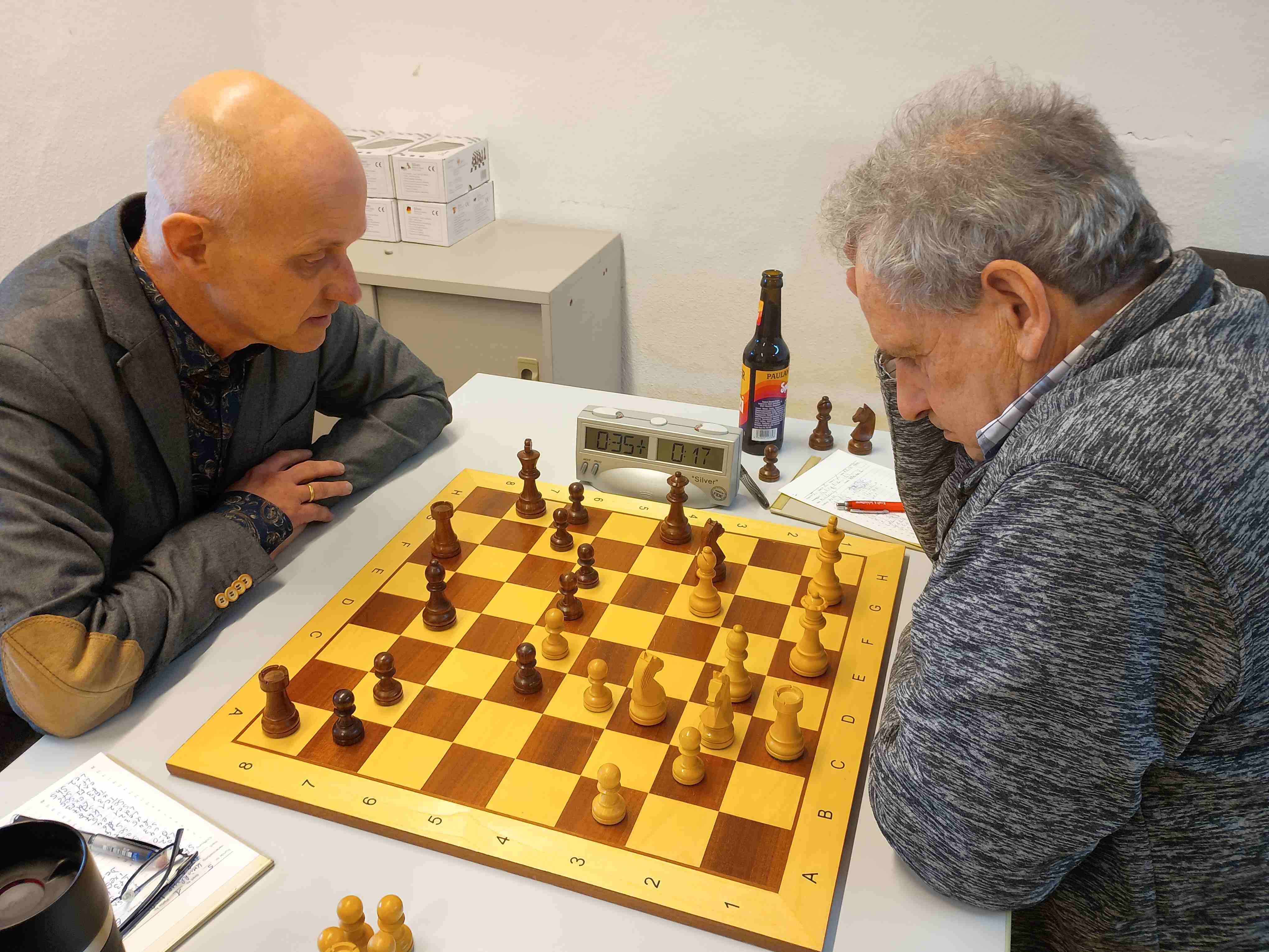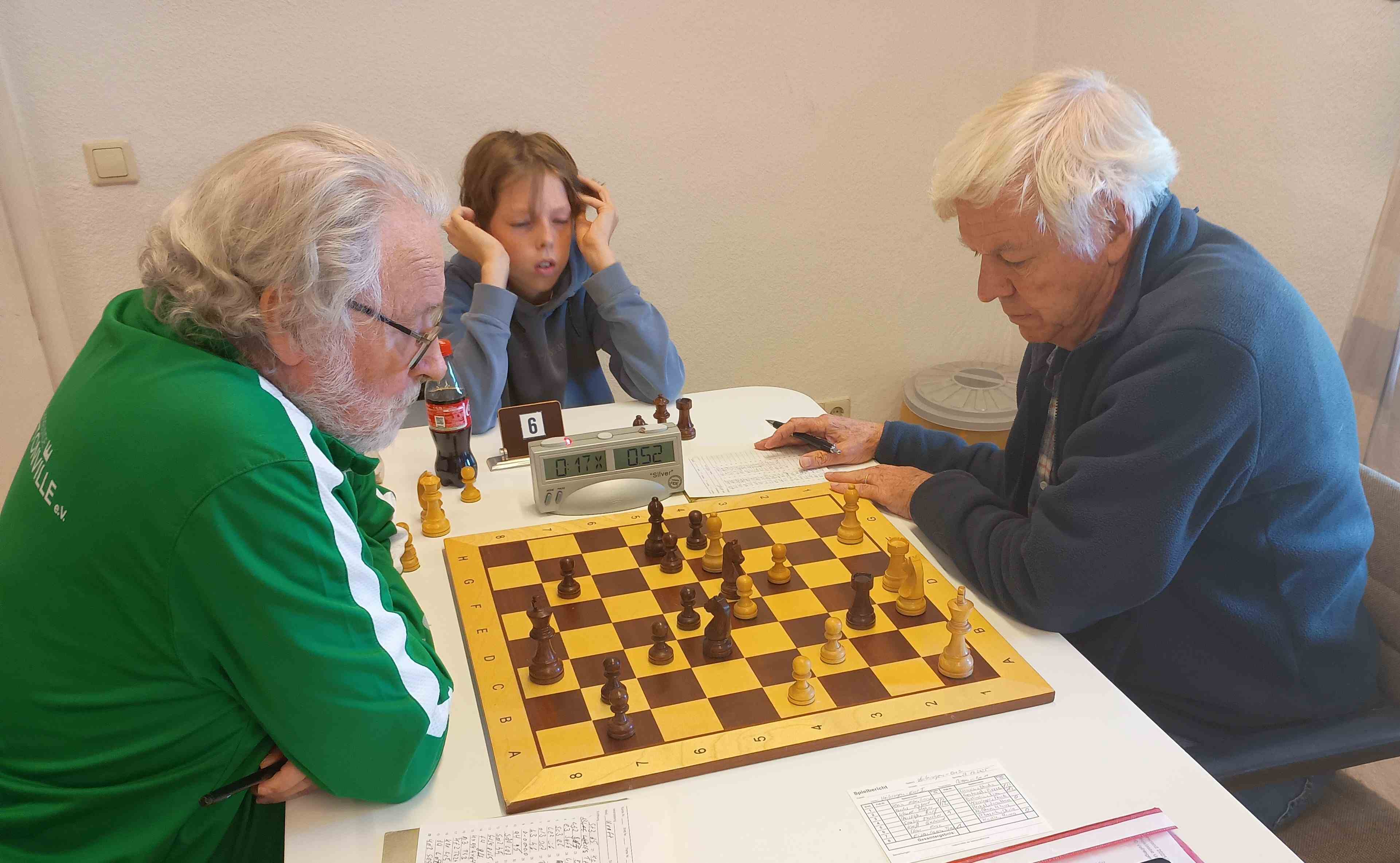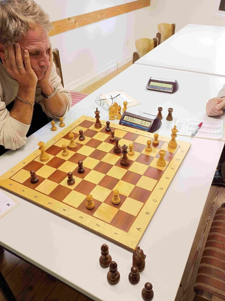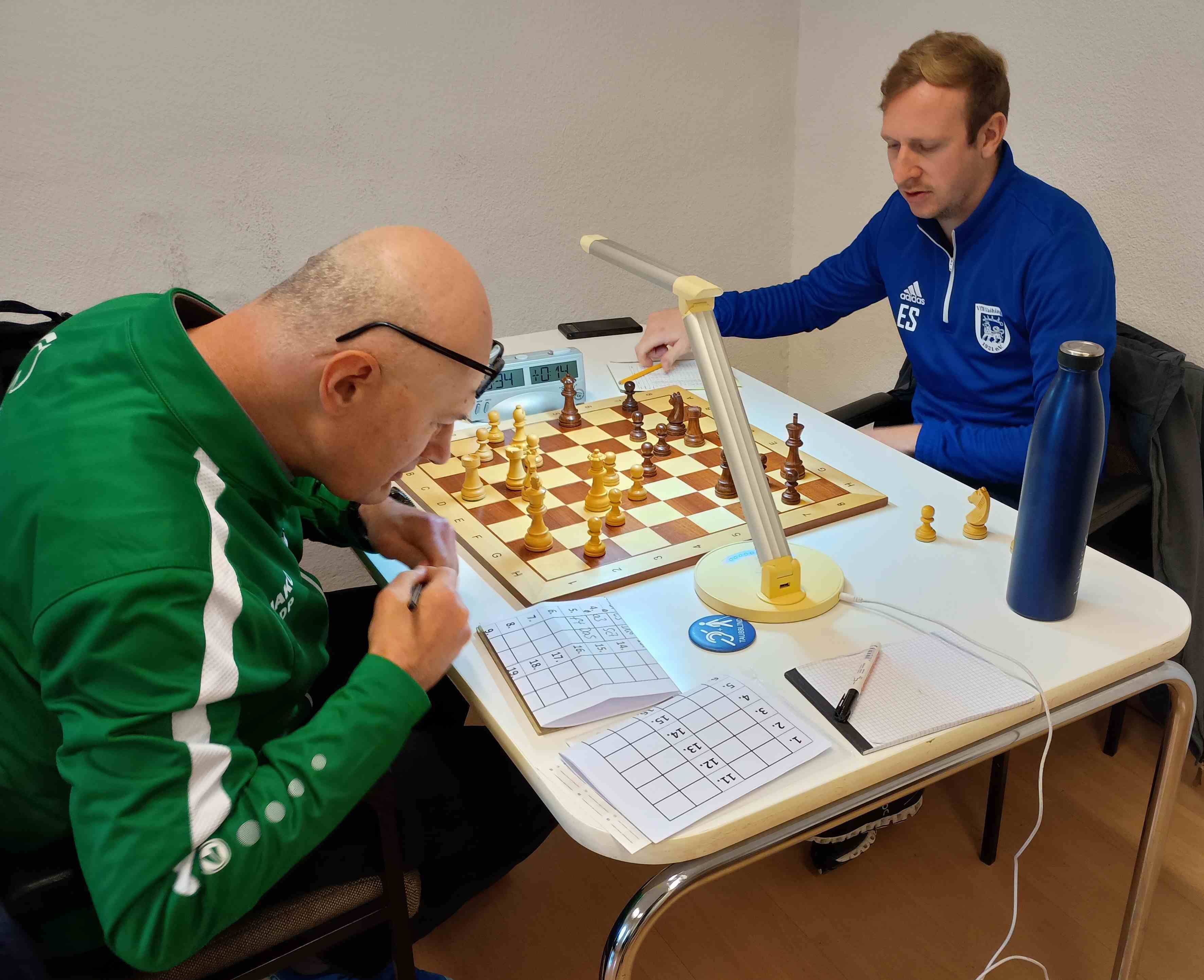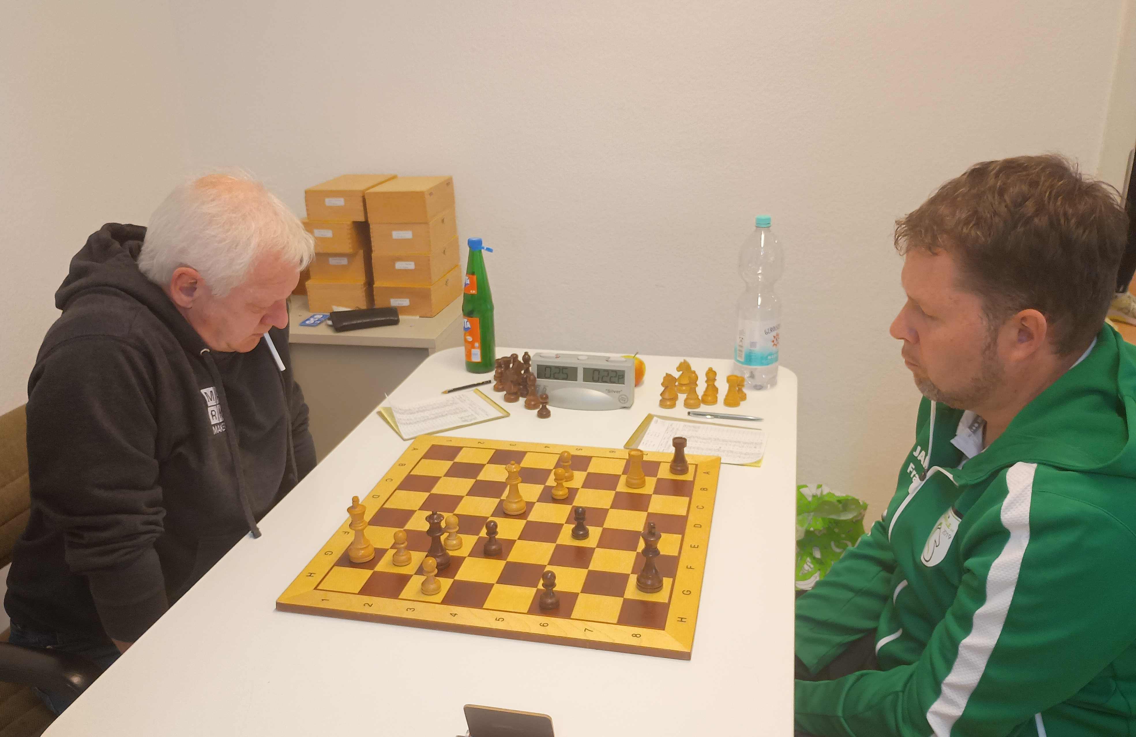 2025 beteiligt sich auch die SVG Vaihingen/Enz mit ein 4-rer Mannschaft an diesem besonderen Pokal-Turnier im Schachbezirk Unterland mit den Gruppen Nord (ehemaliger Kreis Heilbronn und Hohenlohe) und Gruppe Süd (ehemaliger Kreis Ludwigsburg). Es wird in 3 Wertungsgruppen gespielt, Gruppe A: Bundes- bis Landesliga, Gruppe B: Bezirksliga und Kreisklasse, Gruppe C: A-Klasse und darunter. Und es gibt hier eine ganz spezielle Bedenkzeitregelung: Die Bedenkzeit für die die ganze Partie beträgt 45 Minuten pro Spieler, aber es gibt es eine Bedenkzeit-Zugabe von 15 sec. pro Zug. Dies bedeutet z.B. bei einer Spieldauer von 40 Zügen gibt es einen Bedenkzeit-Zuschlage von 40 x 15 sec = 600 sec, bzw. 10 Minuten. Und dies bedeutet, dass hier nur Spezialuhren zum Einsatz kommen können, die solch eine Regelung ermöglichen. Und hierbei hatten wir hier in Vaihingen schon ein kleines Problem, so dass diese Begegnung schlussendlich mit einer Punkte-Teilung endete. – aber davon später etwas mehr. Bei dieser Pokalrunde beteiligen sich 18 Mannschaften aus dem Schachbezirk Unterland und davon werden 3 Partien bei den Vereinen gespielt und die letzten 2 Partien bei einer Zentralveranstaltung, diesmal in Pattonville, ausgetragen.Wir starteten also mit unseren 4 Spielern mit dem Bewusstsein, dass die Spieler für die Schachpartie nur 45 Minuten Zeit hatten, also mussten sich unsere Spieler schon sputen, um Ihre Partien innerhalb dieser 45 Minuten zu einem hoffentlich positiven Abschluss zu bringen. Dass es dabei jedoch pro ausgeführten Zug eine Zeitzugabe von 15 sec. gibt hatten die meisten Spieler nicht so ganz auf Ihrem Gedanken-Schirm und spielten fast alle recht zügig. Und den Ingersheimern Spielern ging fast so ähnlich wie den Unsrigen. Die Gesamtspielstärke war im Durchschnitt zwar in etwa ausgeglichen, so dass es wohl auf die die Tagesform der einzelnen Spieler ankam und wer mit dieser ungewohnten Bedenkzeitregelung am besten zurecht kommt. Unser Spieler, Eric Skär, mit seiner niedrigen „DWZ-Spielstärkenzahl 0“ (eine solche Wertungszahl erhält man erst nachdem man einige offiziell Schachturnier gespielt hat) erkämpfte sich am 4. Brett in der Endspielphase der Partie einen beachtlichen Vorteil, so dass sein erfahrenes Gegner, Martin Schuch, die Partie aufgeben musste. Da aber fast zur selben Zeit unser Hansjörg Mecke seine Partie gegen Andreas Konz leider verlor, war der Punktestand wieder ausgeglichen. Die beiden restlichen 2 Partien von Eberhard Klein gegen Gustav Nistler und Ben Pletinckx gegen Edgar Jehle (die Vaihinger Spieler sind die erst genannten) dauerten länger und sie kamen schön langsam mit Ihrer Bedenkzeit an die 45 Minuten je Spieler heran und hier ist dann dem ein und anderen Spielern aufgefallen, dass Ihre Schachuhren diese 15 sec- Bedenkzeit-Zugabe gar nicht berücksichtigt hatten. D.h., bei der Einstellung der Uhren auf diese Sonderregelung ist wohl ein technisch bedingter Fehler passiert. Nach einer kurzen Diskussion zwischen den Vaihinger – und Ingersheimer Schachspieler einigten sich beide Vereine auf eine faire Punkteteilung für die letzten beide Partien, somit endete diese Begegnung mit dem Gesamtergebnis Remis.