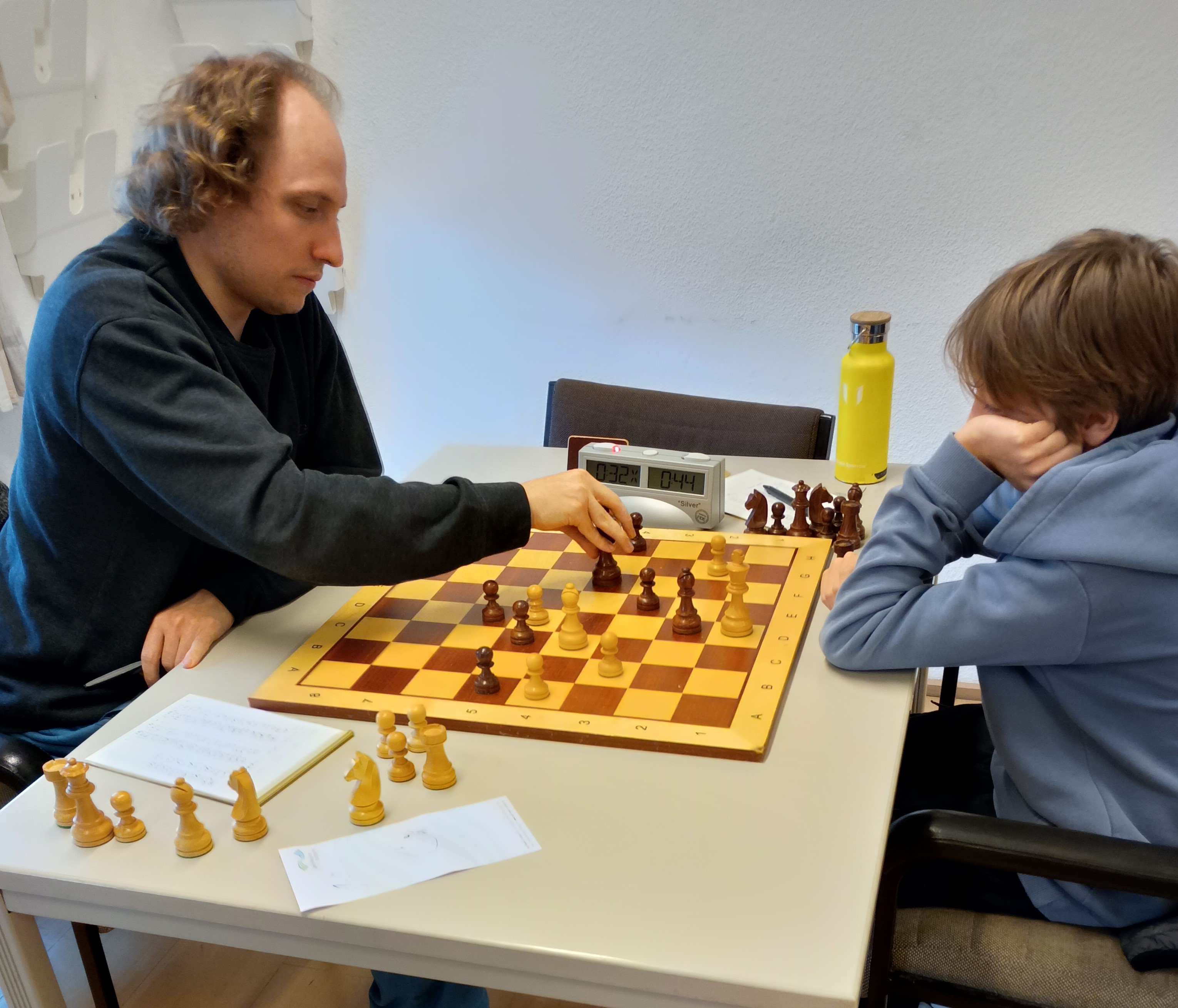 Zum Saisonauftakt musste unsere Mannschaft gegen Besigheim antreten. Ben setzte seinen Gegner Lennox Leidel (1319) von Anfang an stark unter Druck, kam mit Vorteil aus der Eröffnung und entschied kurz darauf die Partie für sich. Timo ließ sich von seinem Gegner Carlos Weiler (1097) in die Defensive drängen. Dadurch dass er die Rochade vernachlässigte, konnte Carlos Timos Springer schlagen und gleichzeizig noch König und Turm gabeln. Diesen Nachteil konnte Timo nicht mehr ausgleichen und verlor die Partie im Endspiel. Auch bei Arthur lief es nicht gut, er verlor durch Unachtsamkeit schon früh eine Figur gegen Vincent Ludwig (918) und konnte diese nicht wieder zurückgewinnen. Beim Spiel Felix gegen Jonathan Wuggenig (759) war das Spiel lange ausgeglichen bis es Jonathan gelang die Qualität zu gewinnen. Kurze Zeit später gelang es Felix den Turm seines Gegners zu gewinnen. Allerdings war der Vorteil nur von kurzer Dauer, den Felix gab den Turm ein paar Züge später wieder zurück. Das Endspiel Turm gegen Läufer konnte schließlich Jonathan für sich entscheiden.Somit haben wir unser erstes Spiel gegen Besigheim leider 3-1 verloren.