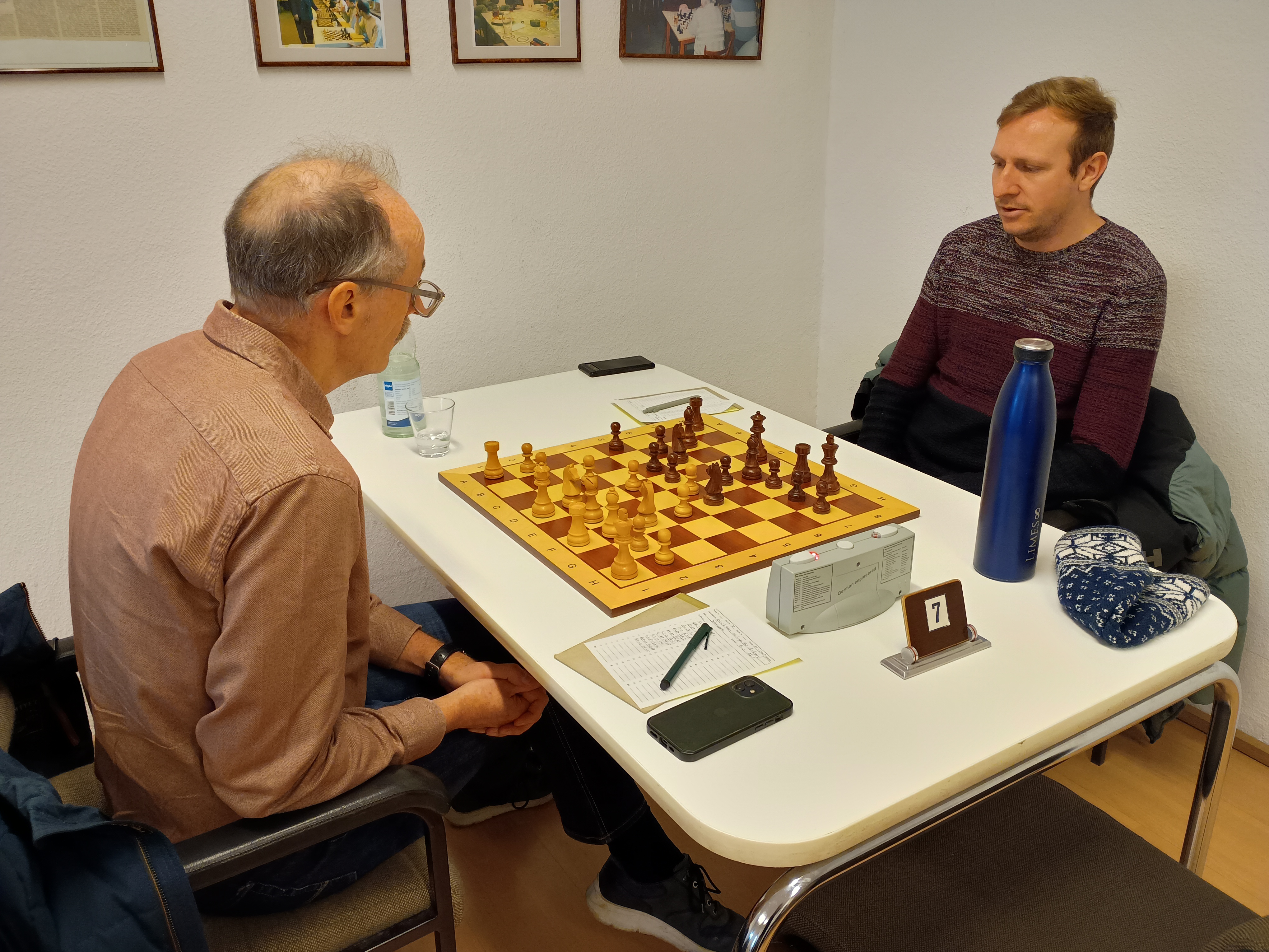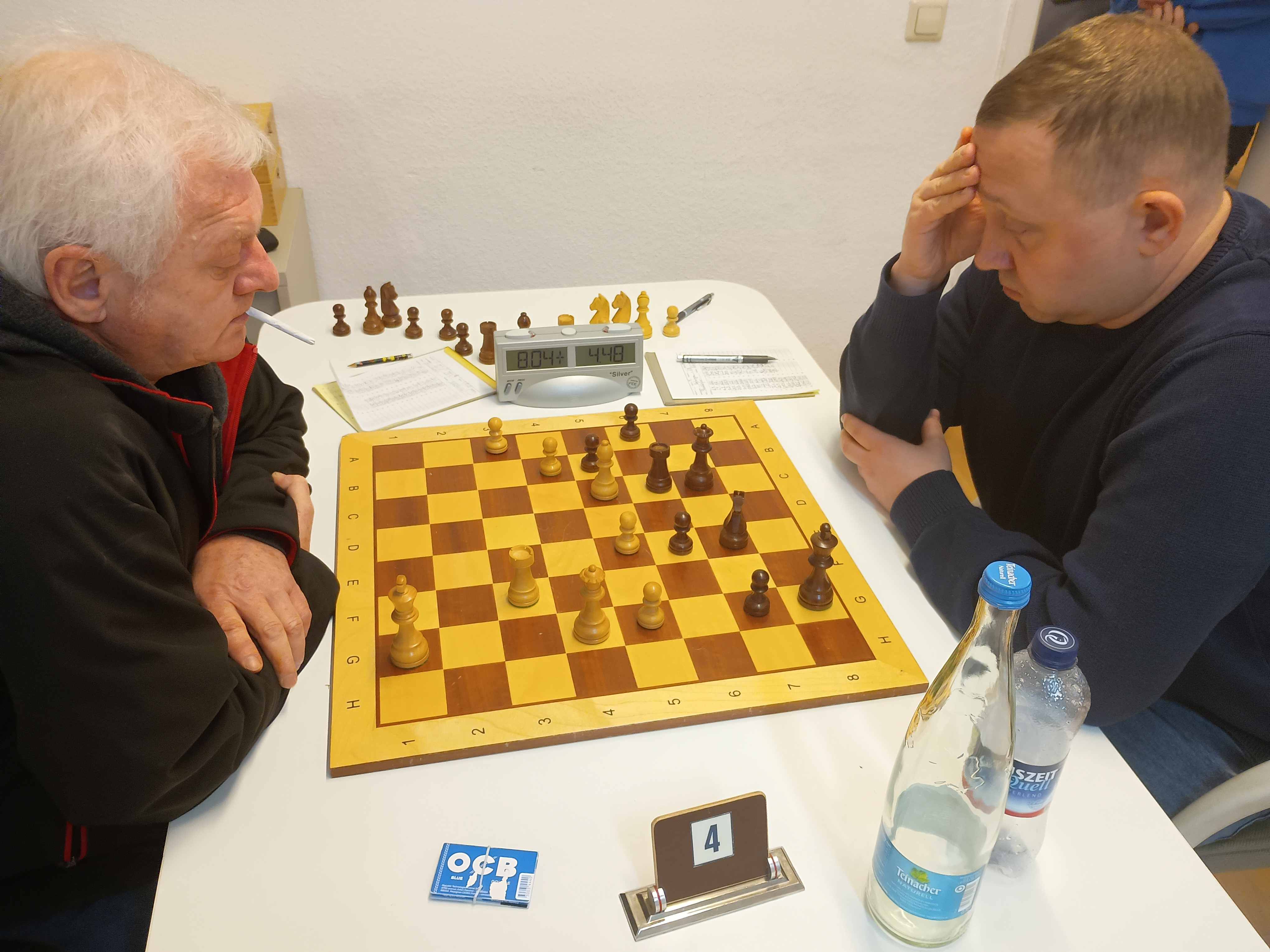 An Brett 4 spielten Karim und Jonas Kuttig beide ihr erstes Mannschaftsspiel. Karim hatte die bessere Stellung bis er ohne zu schauen eine Figur anfasste und so wegen Berührt-Geführt seinen Vorteil wieder her gab. Als er meinte ein Grundreihenmatt zu sehen verlor er seine Dame, da das Feld von einem Turm abgedeckt war. Kurze Zeit später war das Spiel für Jonas entschieden.